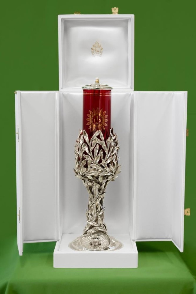 Votive lamp in silver-plated bronze, a unique handcrafted piece. It is composed of intertwined olive branches rising from a worked base, forming the holder that contains the red glass. The coat of arms of Pope Leo XIV has been placed at the center of the base.