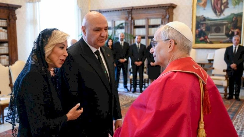 الحبر الأعظم مستقبلاً في الفاتيكان الرئيس اللبناني جوزيف عون والسيدة الأولى نعمت عون